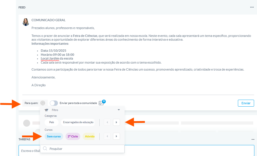 This setting can be adjusted in the system configurations, allowing other profiles to post in the general feed according to the school’s communication policy.How to Post in the General Feed