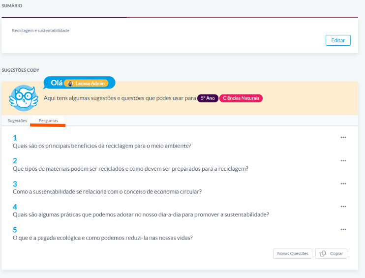 In lesson mode, e-Schooling offers the Cody Suggestions feature, which provides practical activities and guiding questions related to the lesson topic.