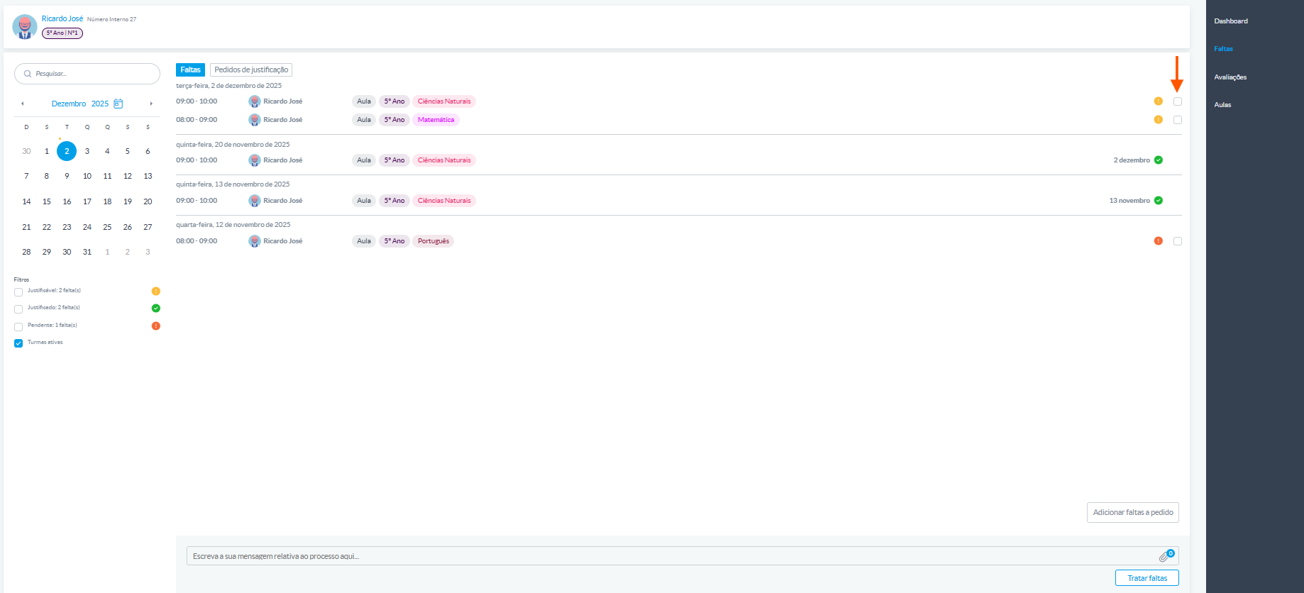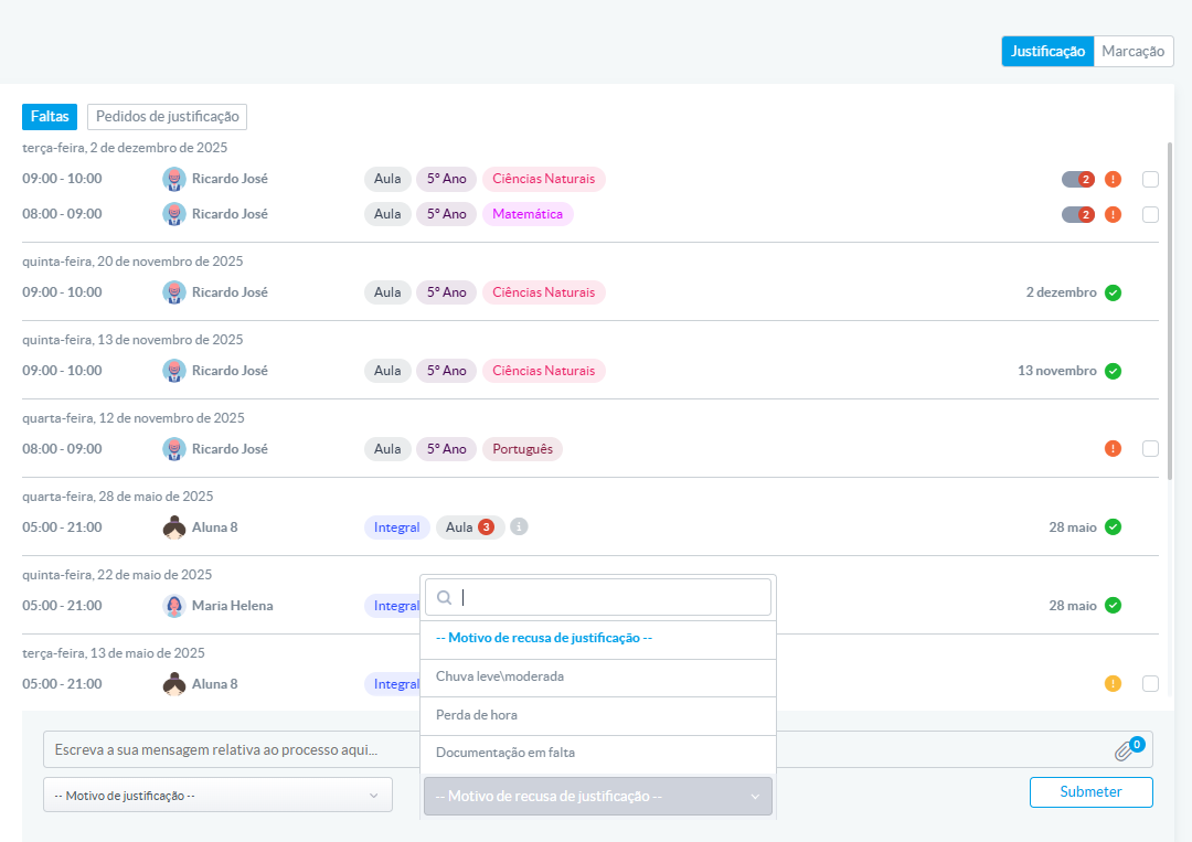 Puede justificar una ausencia individualmente o seleccionar varias ausencias para justificarlas de forma masiva
