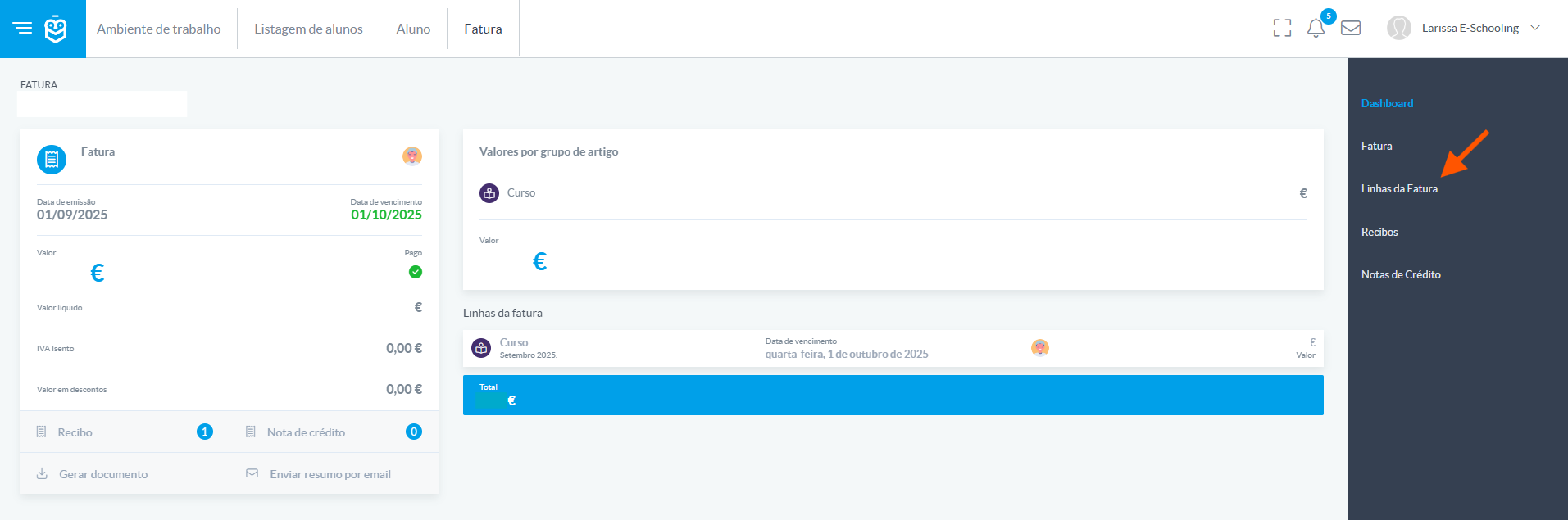 Se abrirá una nueva página con los detalles de la factura y la sección Líneas de factura.