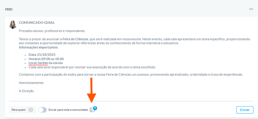 Esta configuración se puede ajustar en las configuraciones del sistema, lo que permite que otros perfiles publiquen en el feed general de acuerdo con la política de comunicación de la escuela.Cómo publicar en el feed general