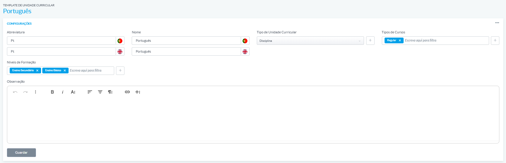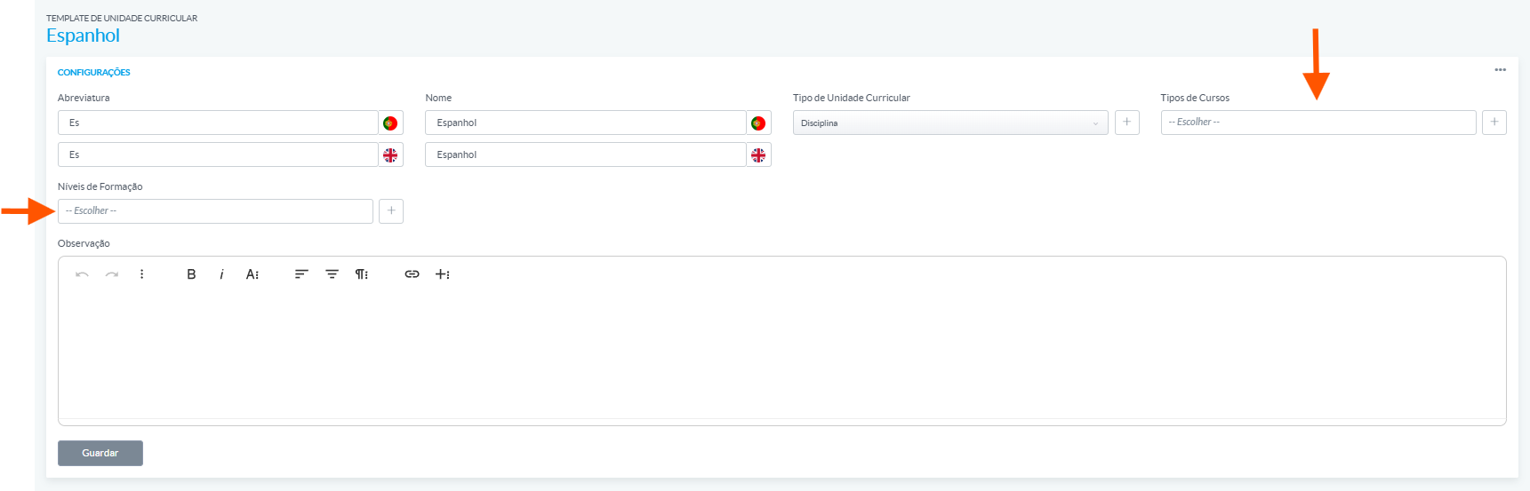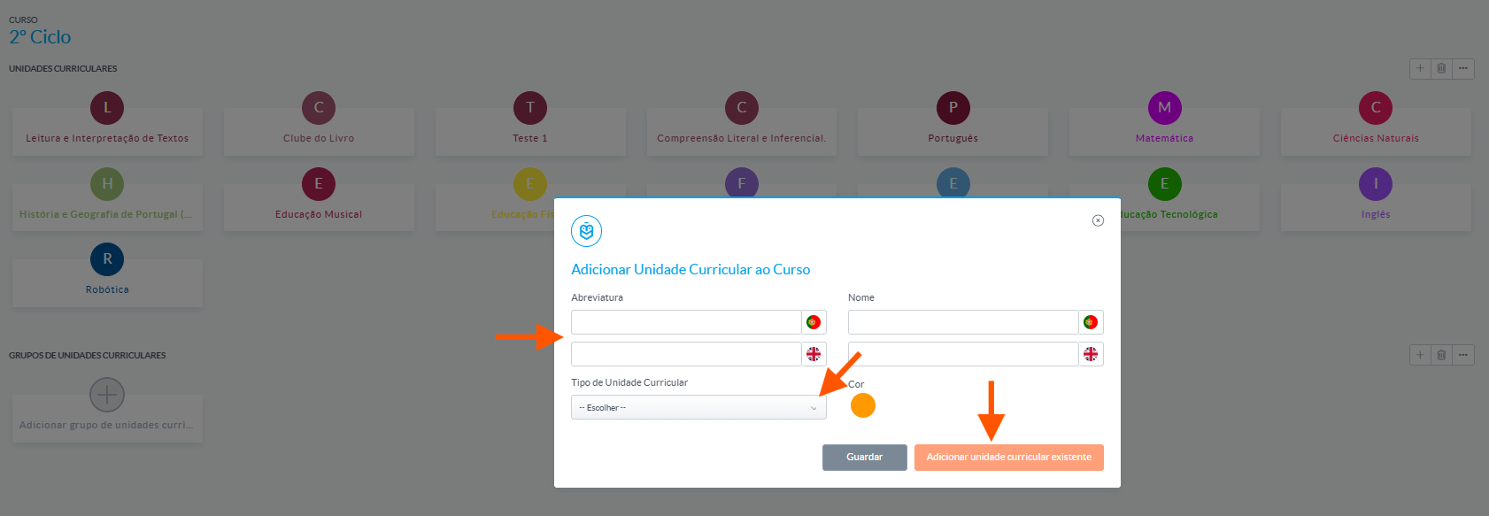 A partir de ahí, puedes ajustar campos como el nombre, abreviatura, tipo de unidad curricular, color, notas, carga de trabajo, entre otros.