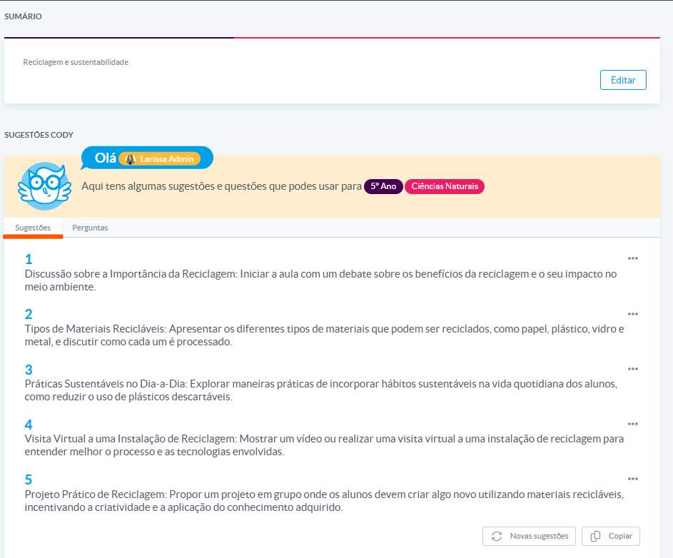 Al introducir el tema en el campo Resumen, el sistema muestra automáticamente sugerencias que pueden utilizarse para dinamizar la lección, fomentar la participación activa de los alumnos y estimular el pensamiento crítico. Estas ideas se pueden aplicar en el feed de la lección, en las tareas o en las discusiones del aula.