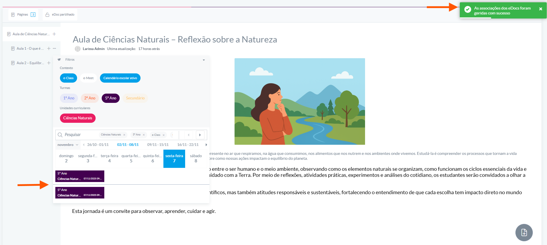 Solo los profesores pueden asociar páginas o capítulos. Por lo tanto, si el usuario no tiene ningún enlace a ninguna lección, no se mostrará ningún evento para su asociación.La asociación de páginas o capítulos específicos de un e-Doc con eventos garantiza que los participantes tengan acceso directo al material relevante, evitando confusiones y mejorando la organización. Esta práctica contribuye a una experiencia pedagógica más eficiente, permitiendo a profesores y estudiantes encontrar rápidamente el contenido necesario en el contexto adecuado.