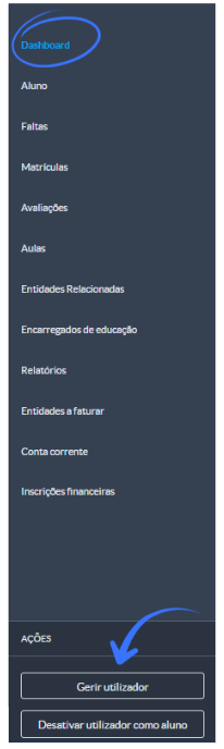 Vaya al perfil de la entidad (Estudiante, Profesor o Miembro del personal) y, en el submenú correspondiente al tipo de entidad, haga clic en Administrar usuario.