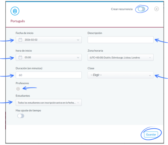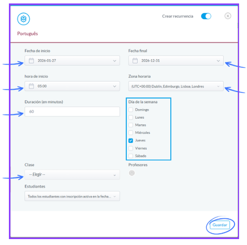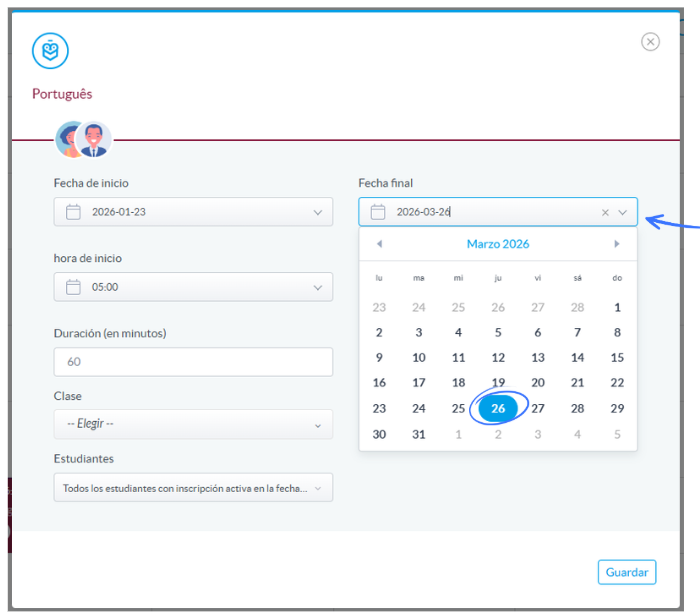 • Fecha de inicio y finalización (dentro del período de la clase)