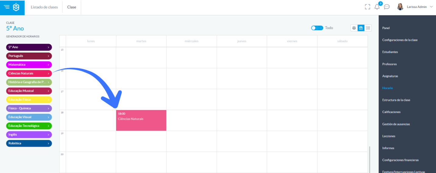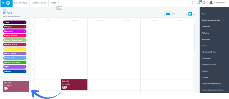 La línea de horario ahora aparecerá en la cuadrícula semanal de la clase.