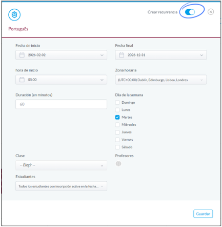 Cuando esta opción está desactivada, el sistema entiende que la lección ocurrirá solo en una fecha específica.