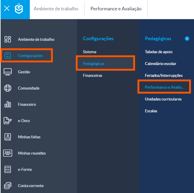 Aceda a Configurações > Configurações pedagógicas > Performance e Avaliações.