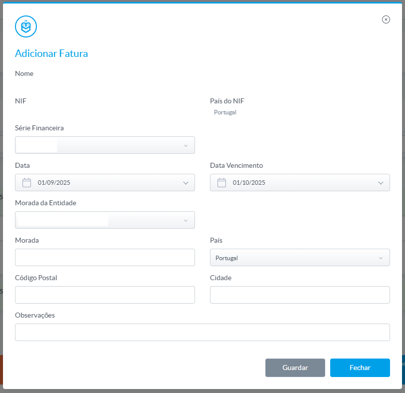 Após guardar, será aberta uma nova página com os detalhes da fatura e a secção “Linhas da fatura”