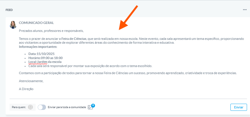 O feed geral é utilizado para comunicações institucionais e mensagens amplas, visíveis para toda a comunidade escolar ou para grupos específicos.
