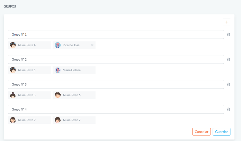 A funcionalidade de criação de grupos no modo aula oferece uma gestão dinâmica e flexível da turma. Embora o sistema sugira uma divisão automática, o docente pode adaptar os grupos conforme os objetivos pedagógicos da aula, promovendo o trabalho colaborativo e a participação ativa dos alunos.