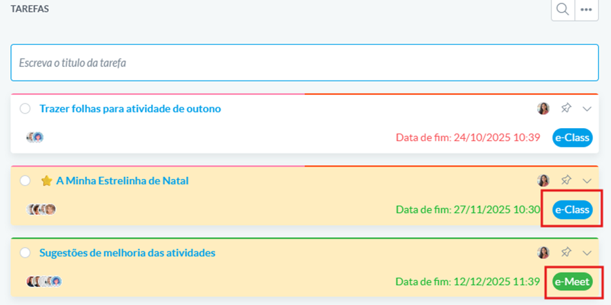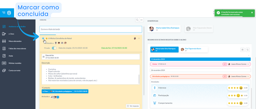 Tudo o que precisa de acompanhar, tarefas criadas por si ou atribuídas por outros fica reunido num único espaço, independentemente de terem sido criadas numa aula, reunião ou noutro ponto do e-Schooling. Assim, o utilizador consegue perceber rapidamente o que ainda falta tratar, o que já está concluído e onde precisa de intervir, de forma simples e sempre à mão.