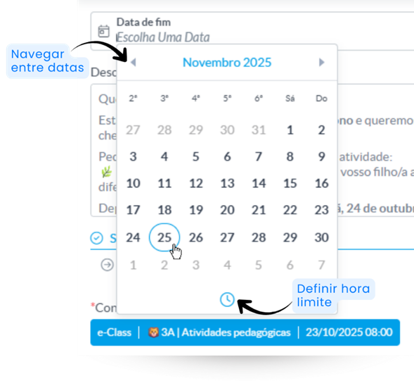 Se quiser definir uma data-limite para a tarefa, clique no campo “Data de fim” e selecione o dia e a hora em que a tarefa deverá ser concluída