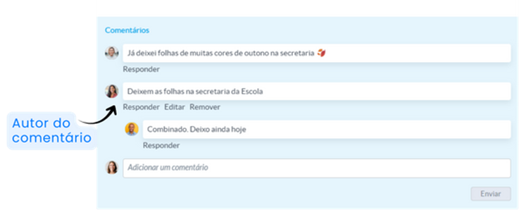 - O autor do comentário pode sempre editar ou remover o seu comentário. As restantes entidades podem visualizar e responder aos comentários.
