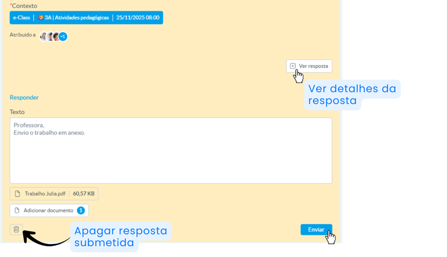 Após submeter a resposta, enquanto a tarefa estiver ativa, a entidade pode editar a sua resposta, adicionando novos ficheiros, removendo ficheiros existentes ou submetendo uma nova resposta.