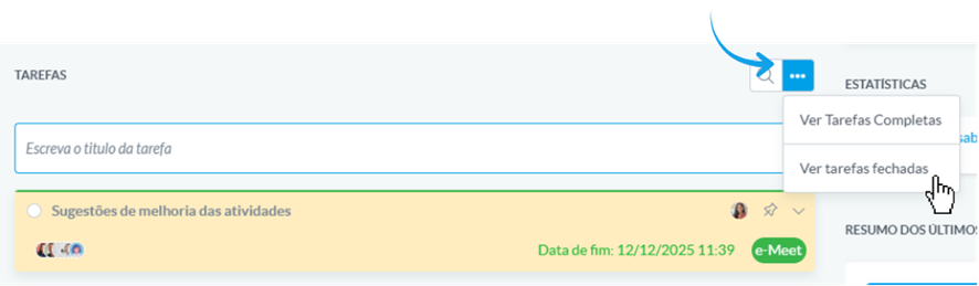 Para consultar todo o histórico de tarefas, clique nos três pontos no canto superior direito do widget.