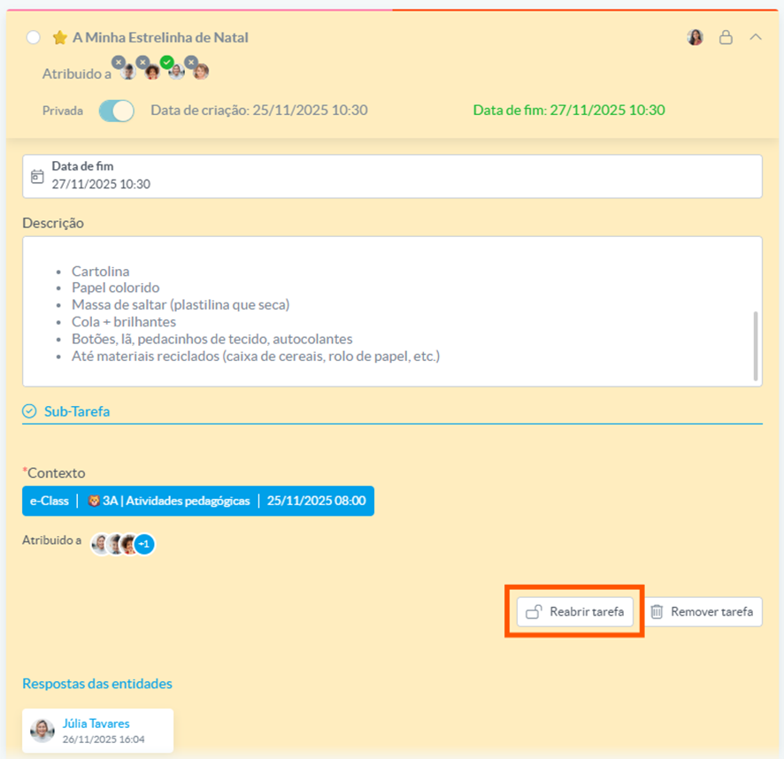 O proprietário pode reabrir a tarefa, permitindo que volte a estar disponível para respostas das entidades atribuídas. Caso não seja reaberta, a tarefa ficará apenas disponível para consulta de histórico.
