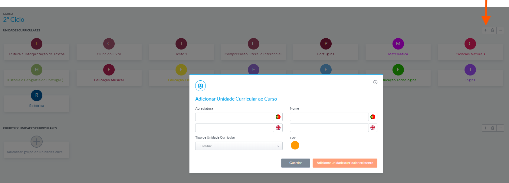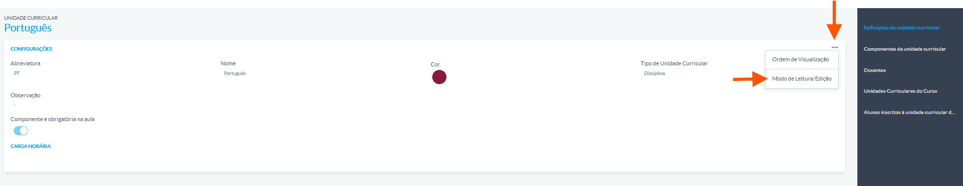 A partir daí, poderá ajustar campos como nome, abreviatura, tipo de unidade curricular, cor, observações, carga horaria, entre outros.