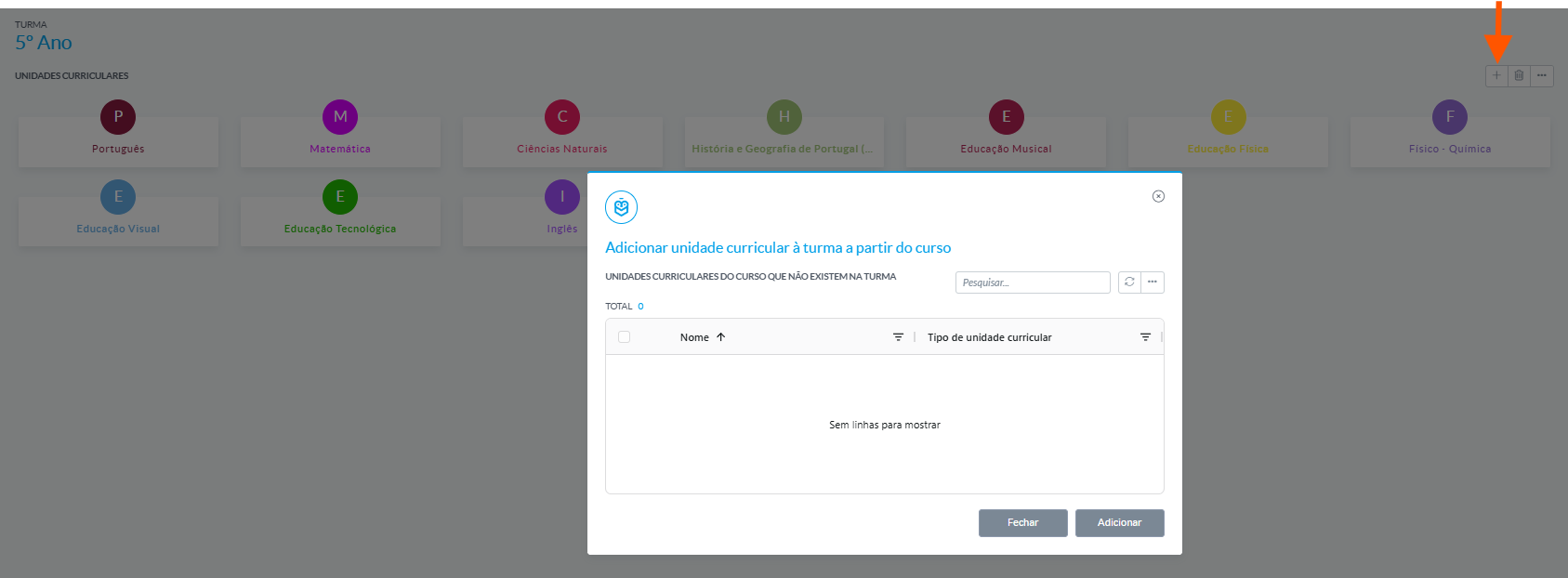 Clique em Adicionar disciplina e selecione a(s) disciplina(s) que pretende associar à turma (com base nas disciplinas já configuradas no curso).