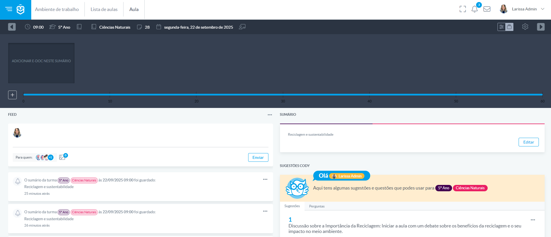 Dentro do modo aula, após definir o Sumário da aula, encontrarás a secção Sugestões Cody, com duas abas: