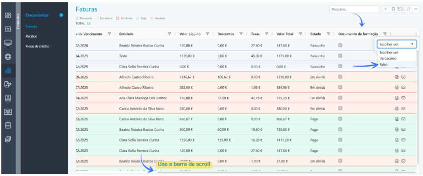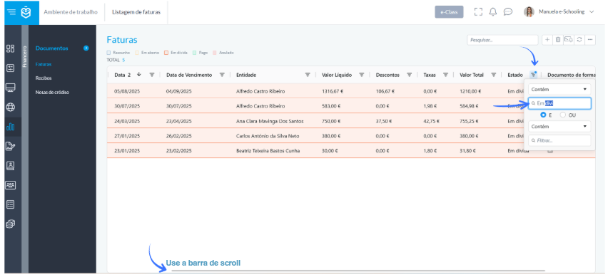 No passo seguinte, deve localizar a coluna Estado e aplicar o filtro Em dívida, para que apenas sejam apresentadas as faturas que necessitam de regularização.
