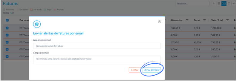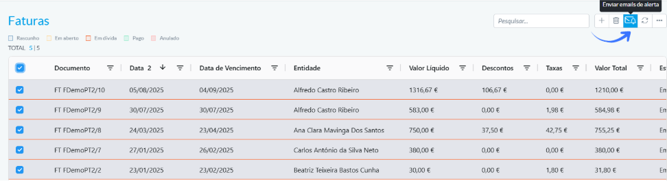 Com as faturas selecionadas, clique no ícone "enviar e-mails de alerta"