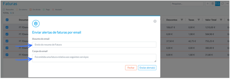 O envio de alertas de faturas em dívida ajuda a manter uma comunicação clara com os responsáveis e contribui para uma gestão financeira mais eficiente, garantindo que todos são informados atempadamente sobre documentos pendentes.