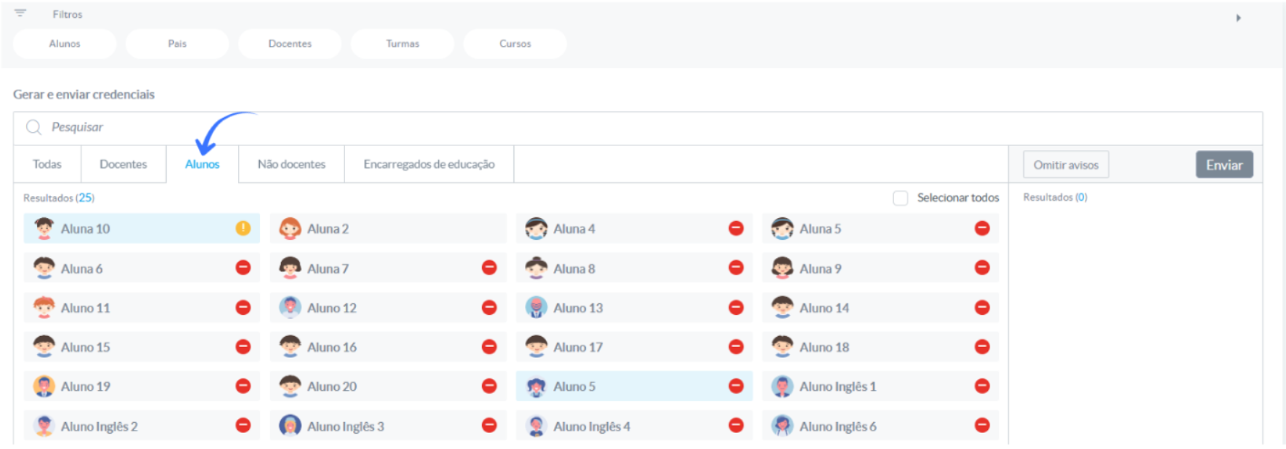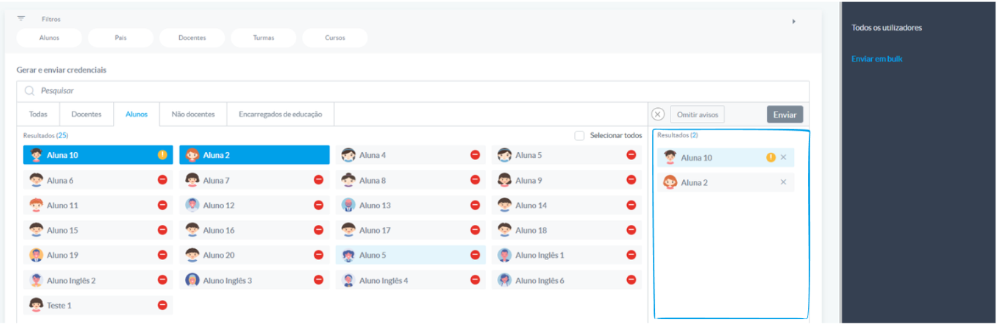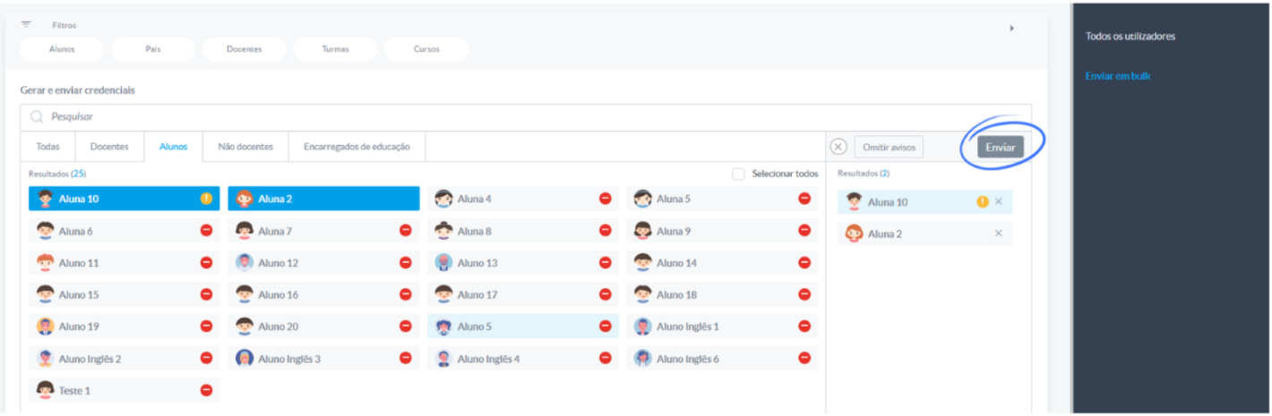 Quando todos os utilizadores pretendidos estiverem na secção Resultados, clique no botão Enviar, localizado no canto superior direito.
